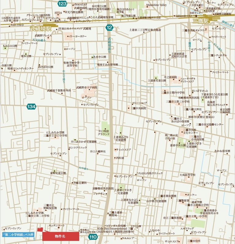 JR中央線「三鷹」駅 バス乗車19~27分「第二小学校前」バス停 徒歩2分 JR中央線「武蔵境」駅 バス乗車12~21分「富士重工前」バス停 徒歩7分~8分 JR中央線「吉祥寺」駅 バス乗車30~32分「第二小学校前」バス停 徒歩2分 |