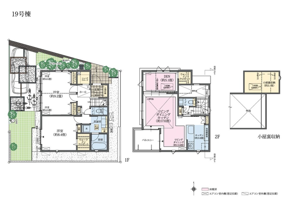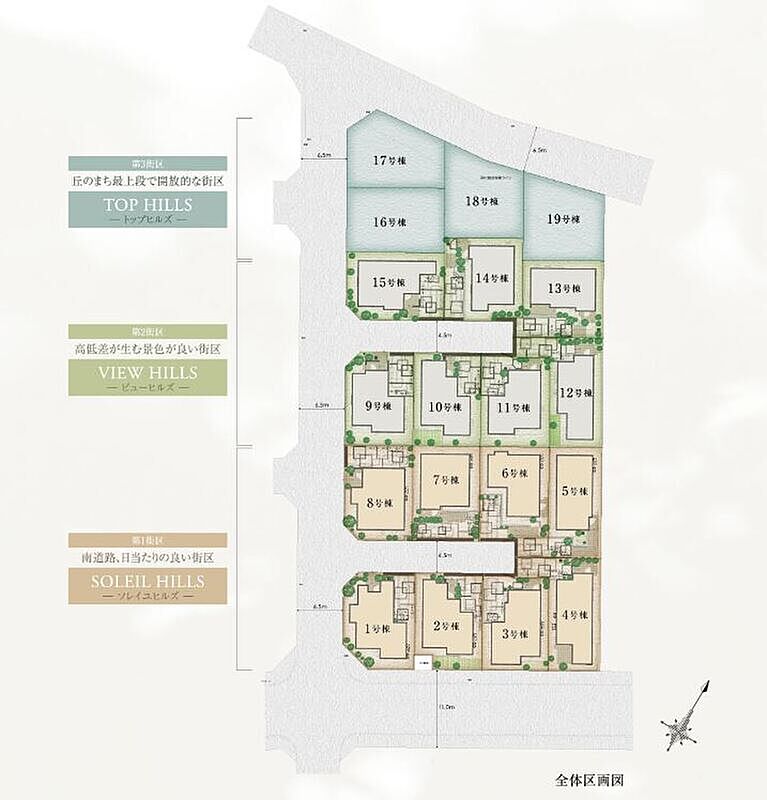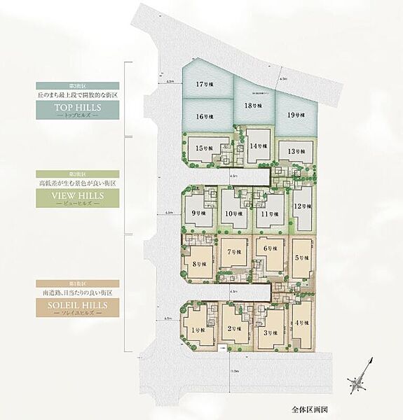 一部高圧線下となる区画があります。(※17号棟、18号棟、19号棟) ゴミ置き場5.00m2(各1/19負担) 雨水調整池(1)(1~8区画)、雨水調整池(2)(9~15区画)※雨水調整池は管理組合を設立し維持管理予定。 屋根の一部に板金屋根を採用しています。 |