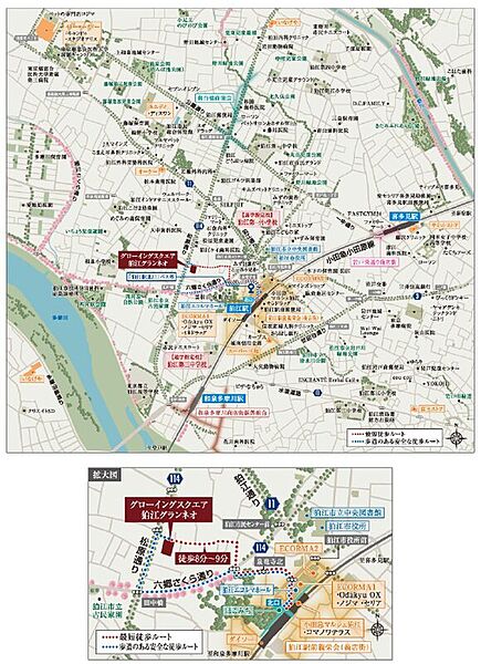 - ※物件から周辺のお店・施設までの距離は、利用が想定される道路を通行した場合の距離です。なお、必ずしも最短距離を保証するものではありません。