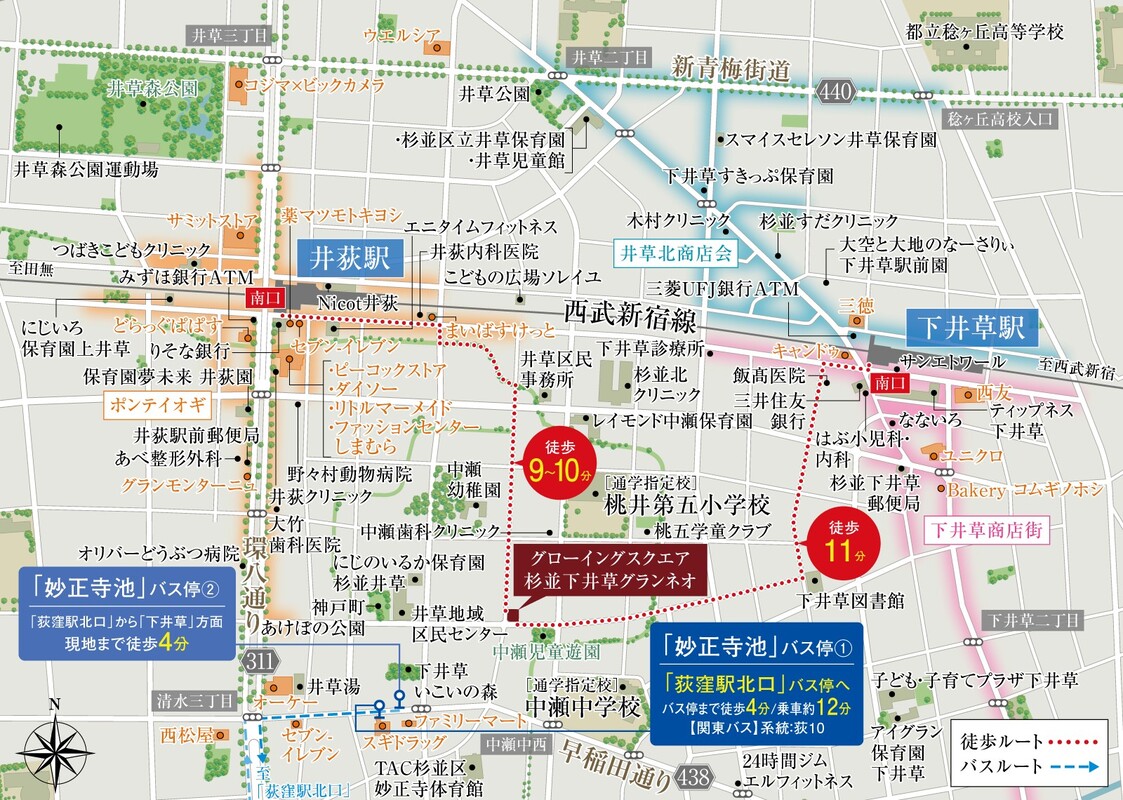 ■西武新宿線「井荻」駅へ徒歩9分~10分、「下井草」駅へ徒歩11分の2駅利用可