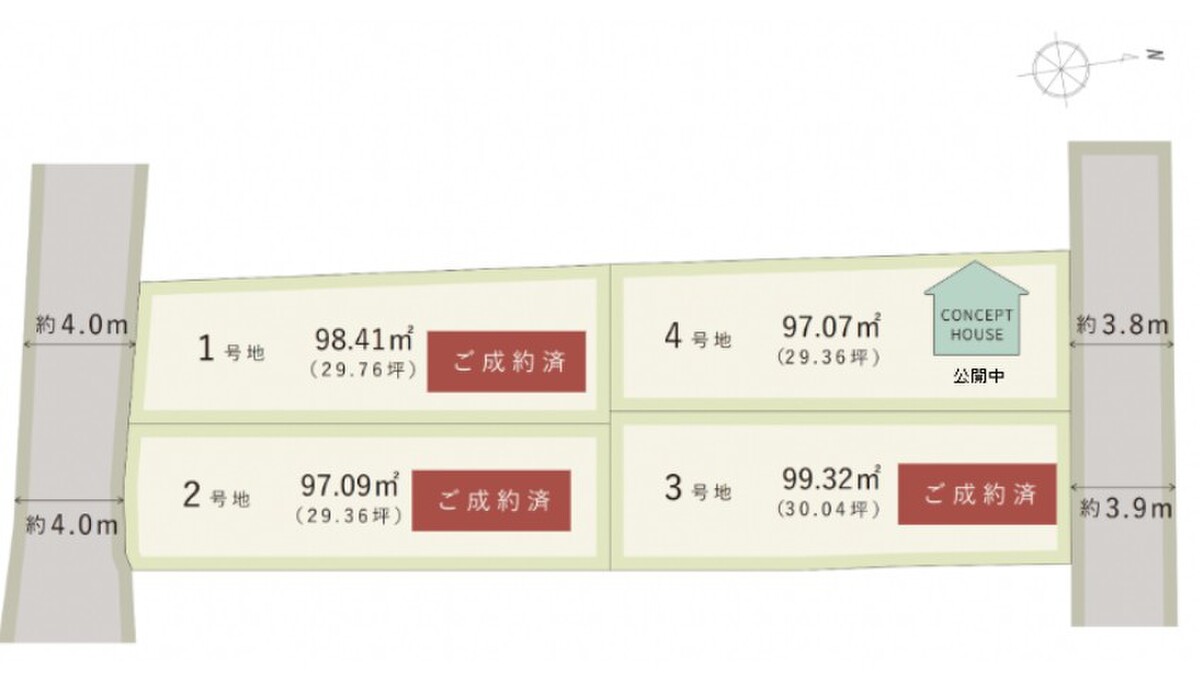 | 駐車場 | 1台 | 道路の幅員 | 道路幅:3.8~4m、セットバック有 4号地:約0.96m2(セットバック済) |