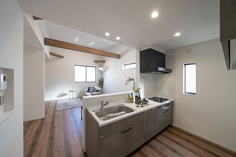 キッチン側から見たリビング・ダイニングスペース。勾配天井の効果で空間が明るく開放的!調理中でもご家族同士、対面での会話を楽しむことができます。