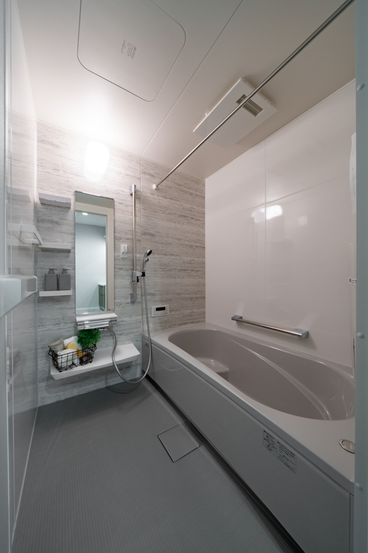 落ち着いた雰囲気の浴室です。バスタブに足を伸ばし、1日の疲れを癒すことができます。浴室乾燥機&ハンガーパイプ付きで、天候や時間帯に関係なく、洗濯物を気持ちよく乾かせます。