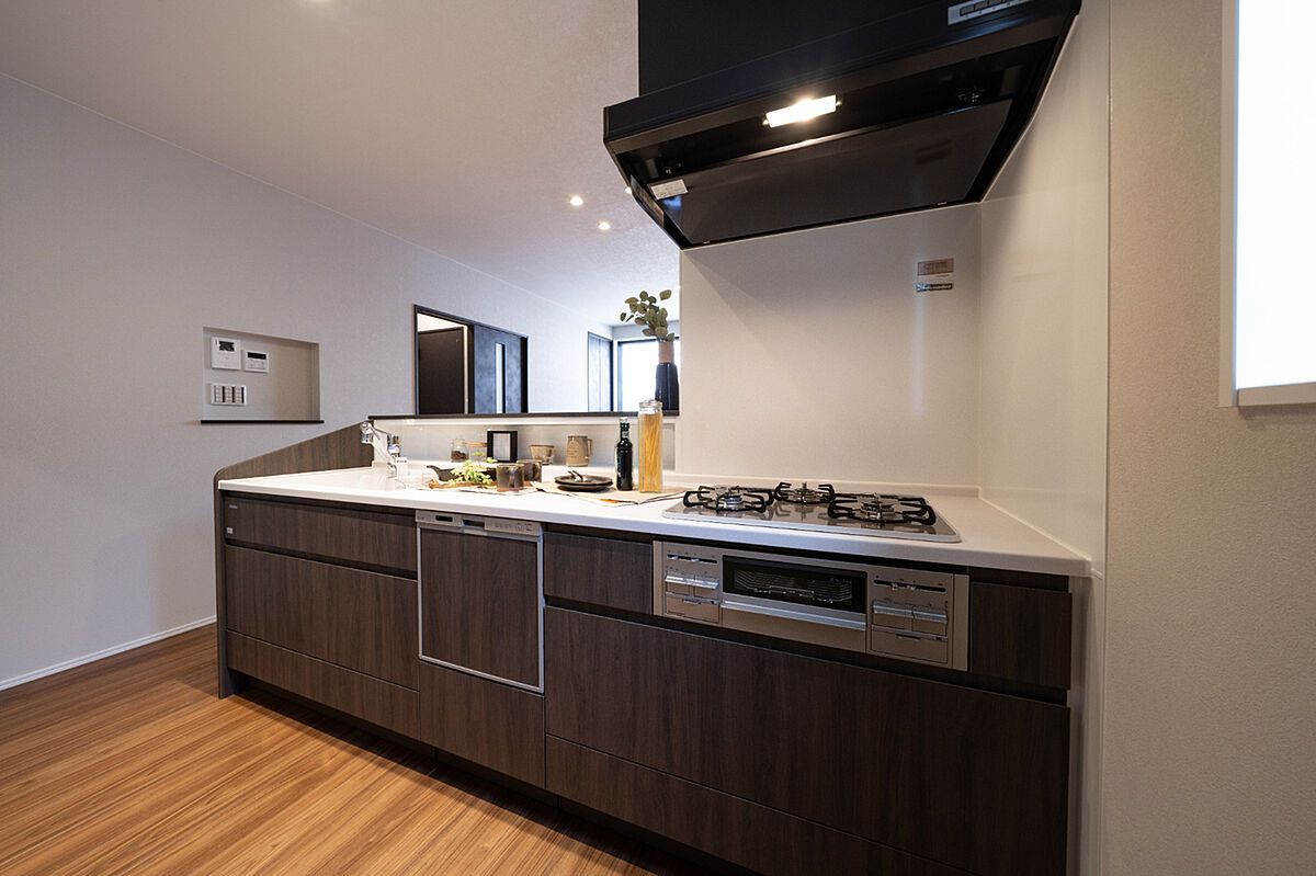 グリル付き3口ガスコンロを採用しているため、同時調理が可能です。カウンター下の収納は、スライド式なので、奥にしまった鍋類などが取り出しやすい仕様です。