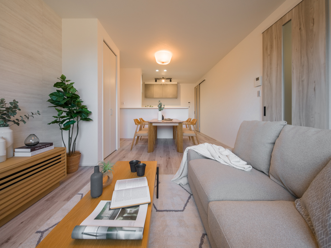 【1】バルコニーに面した開放感のあるLDK空間。心地よい空間で、ゆったりと家族団らんのひとときをお過ごしいただけます。