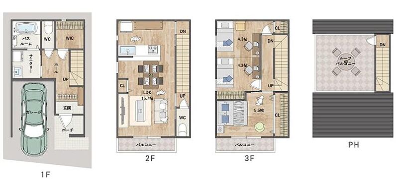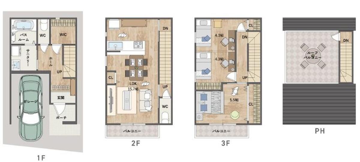 | 間取り | 3LDK+WIC+RoofBalcony | 建物構造 | 木造ガルバリウム鋼板立平葺3階建 |