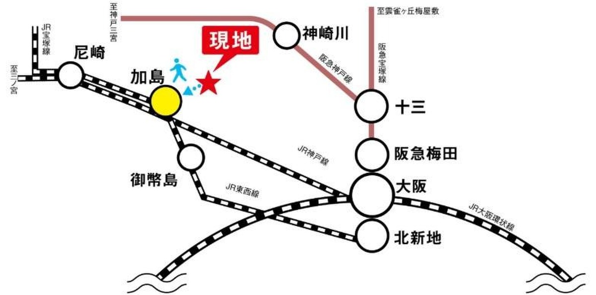 JR東西線「加島」駅 徒歩7分 阪急神戸本線「十三」駅 バス8分「加島中」停留所 徒歩4分 JR東海道・山陽本線「大阪」駅 バス17分「加島中」停留所 徒歩4分 |
