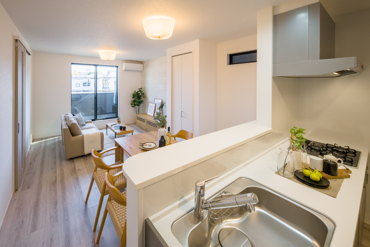 【2】キッチンの前面には腰壁を設けているので、調理中の手元を隠すことができます。階段部分には扉があり、居住部分のプライバシーを守れる間取り設計です。
