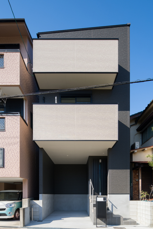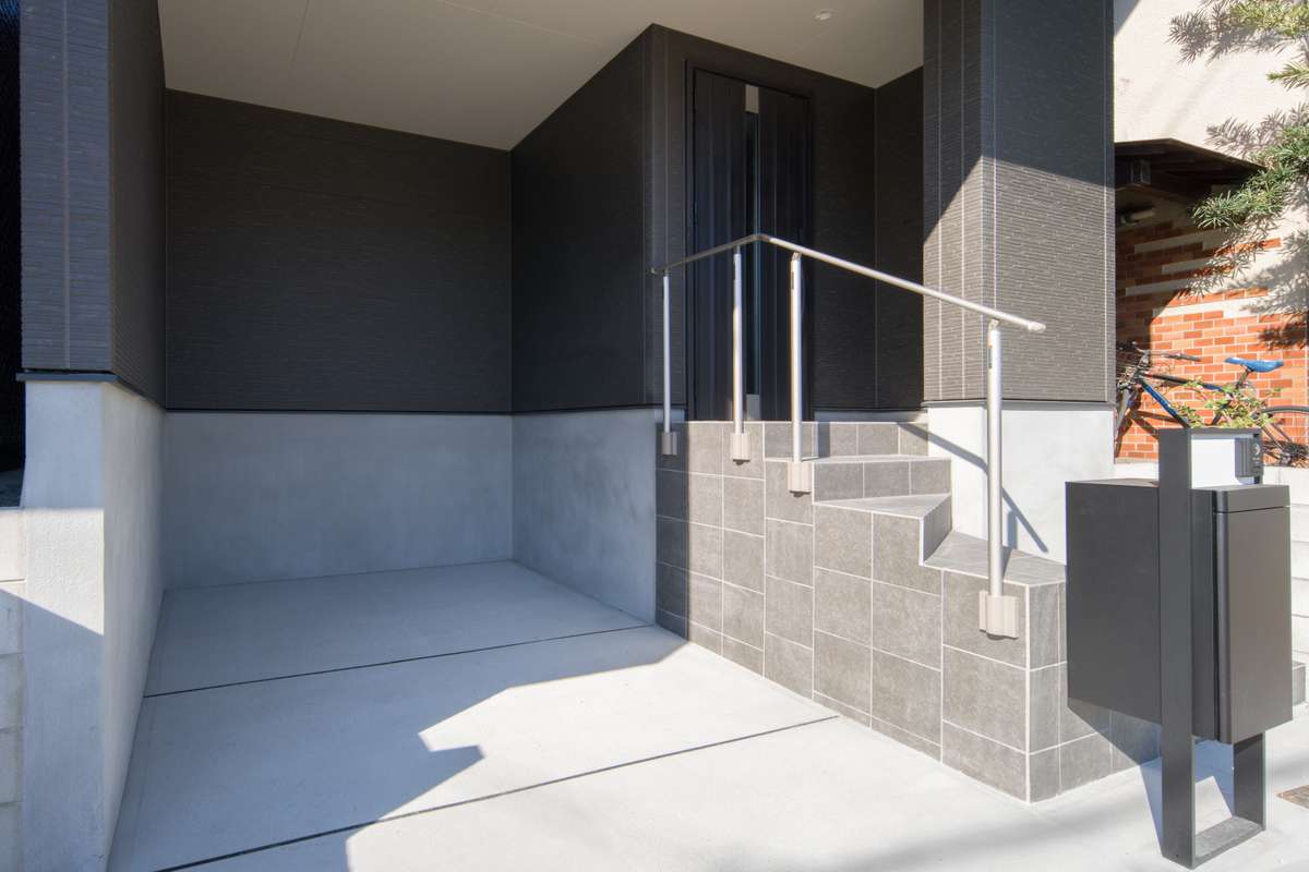 【2】ツートンカラーが印象的な佇まい。玄関は道路と高低差があり、プライバシーにも配慮。雨が降る日もスムーズに車へ移動できるインナーガレージ付き(車種による)。