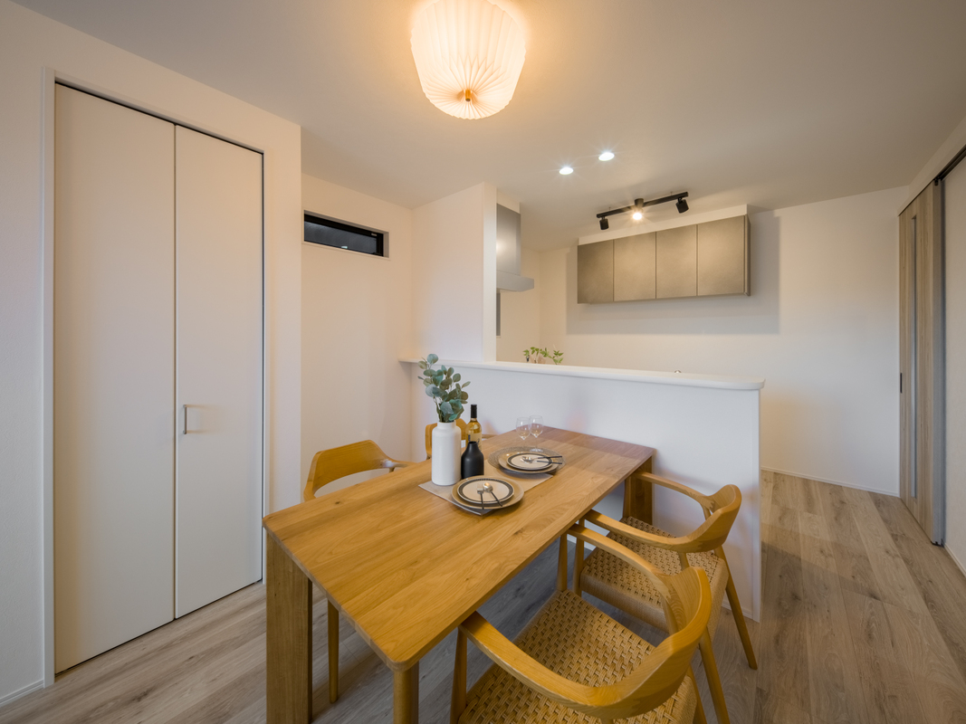 【3】キッチンカウンター前にダイニングテーブルを設置すると、配膳や片付けがスムーズに。調理や片付けをしながらの会話も弾みます◎