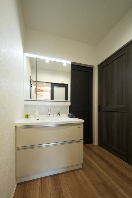 三面鏡付きで朝の身支度もスムーズに。脱衣室が隣接しているため、ご家族間のプライバシーも守りながら、気兼ねなく使用することができます。