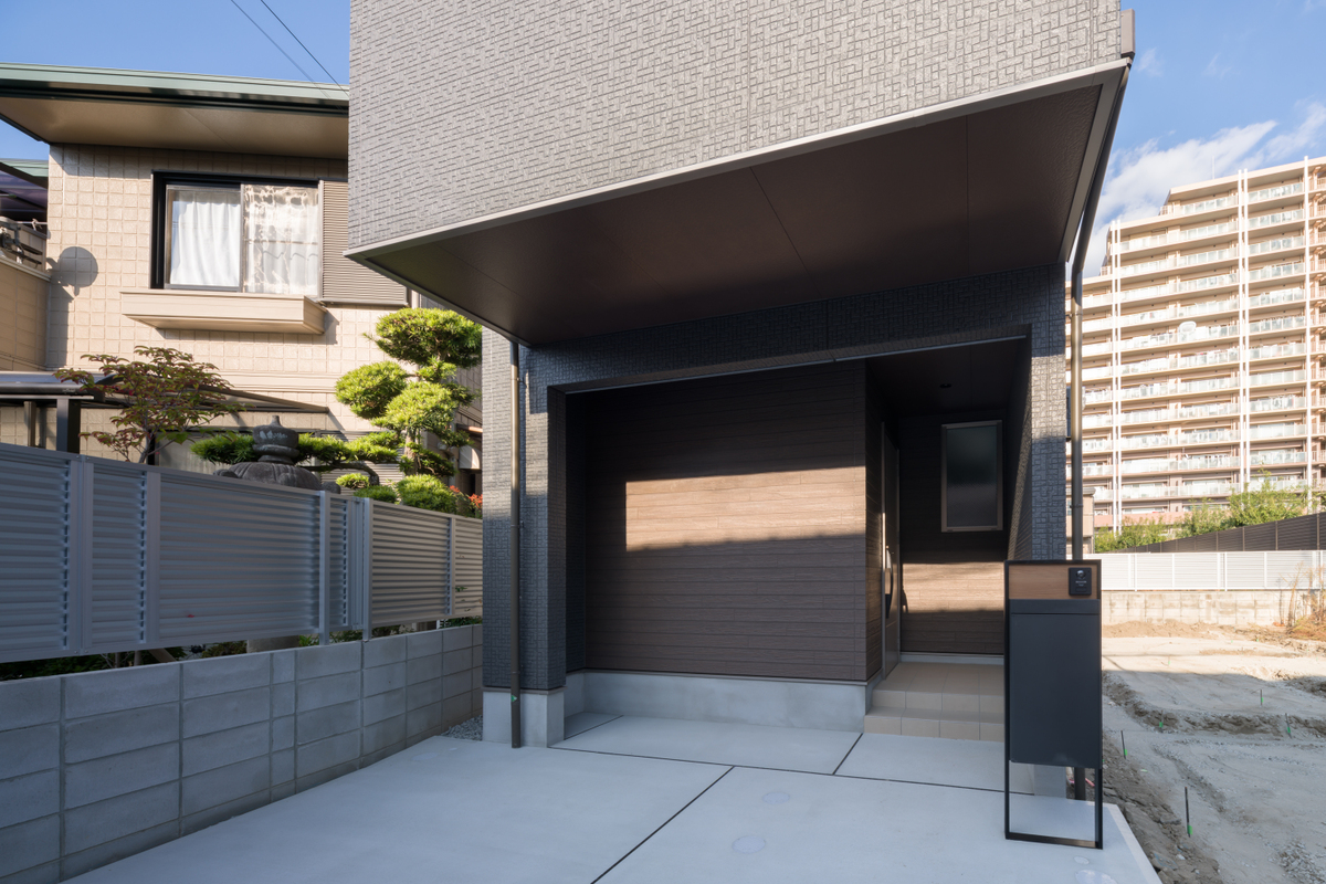 シックなカラーでまとめた重厚感のある佇まい。2階バルコニーは上部吹抜仕様で、より室内に陽光が注ぐ設計に◎1台分のカースペース(車種による)付きです。