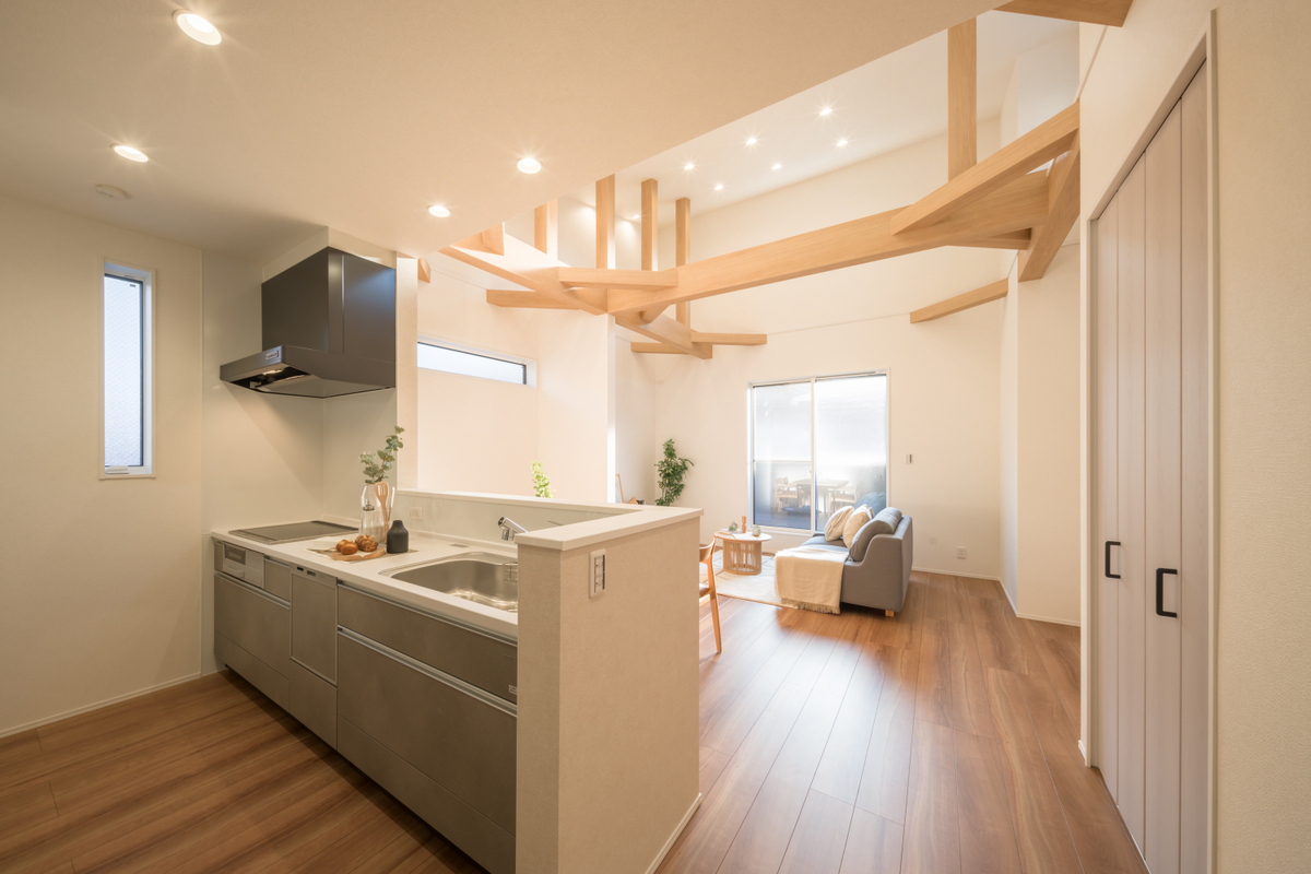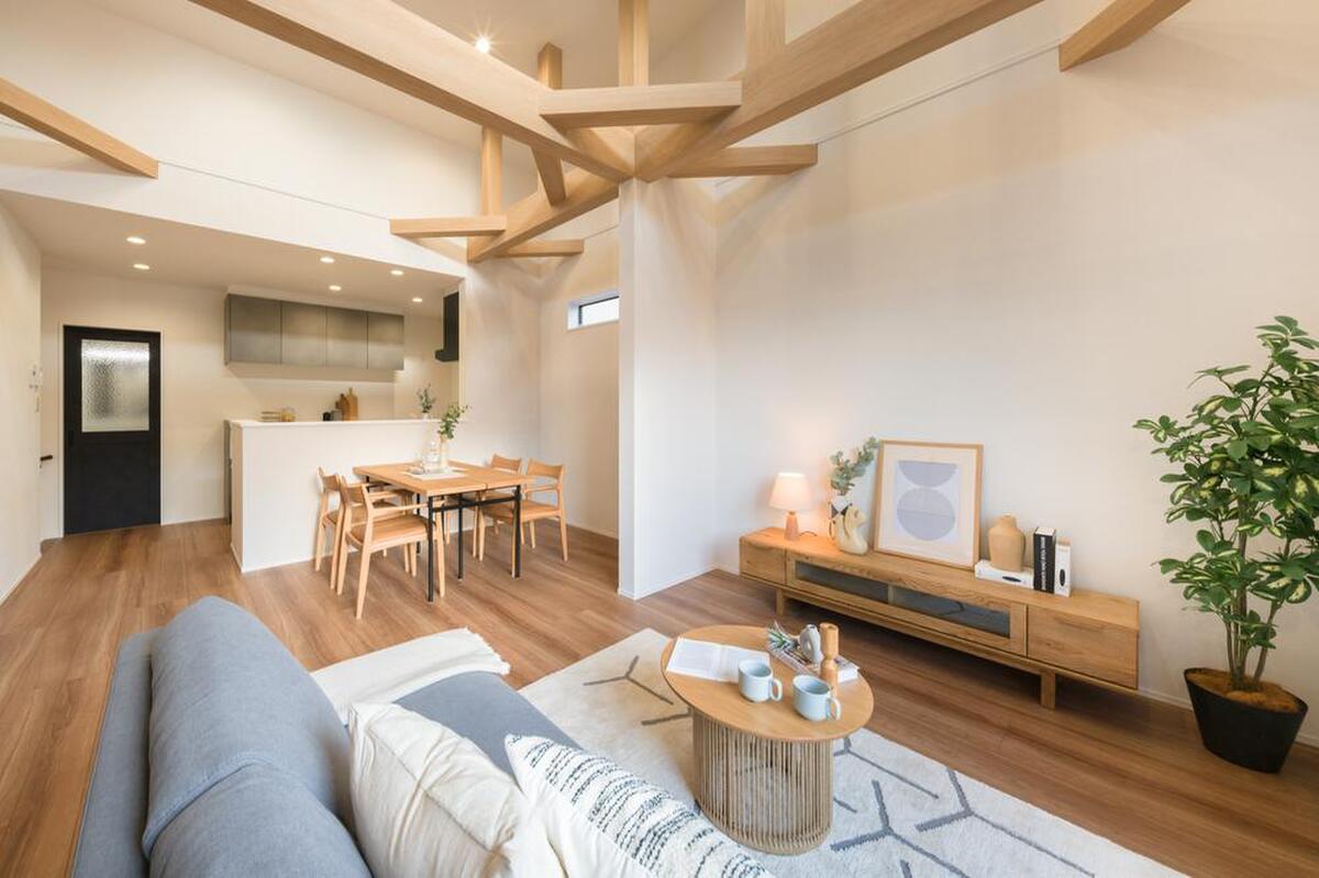見せ梁を凝らした意匠性の高い内装デザイン。清潔感のあるホワイトのクロスに、木目の柔らかな質感がマッチしたナチュラルな雰囲気です。
