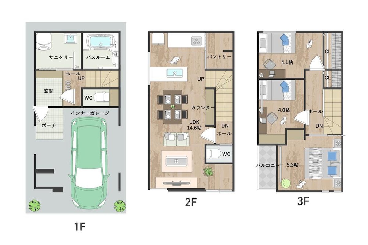 - ※完成予想図やCG合成画像は、門塀・植栽・庭・外観等、実際とは多少異なる場合があります。