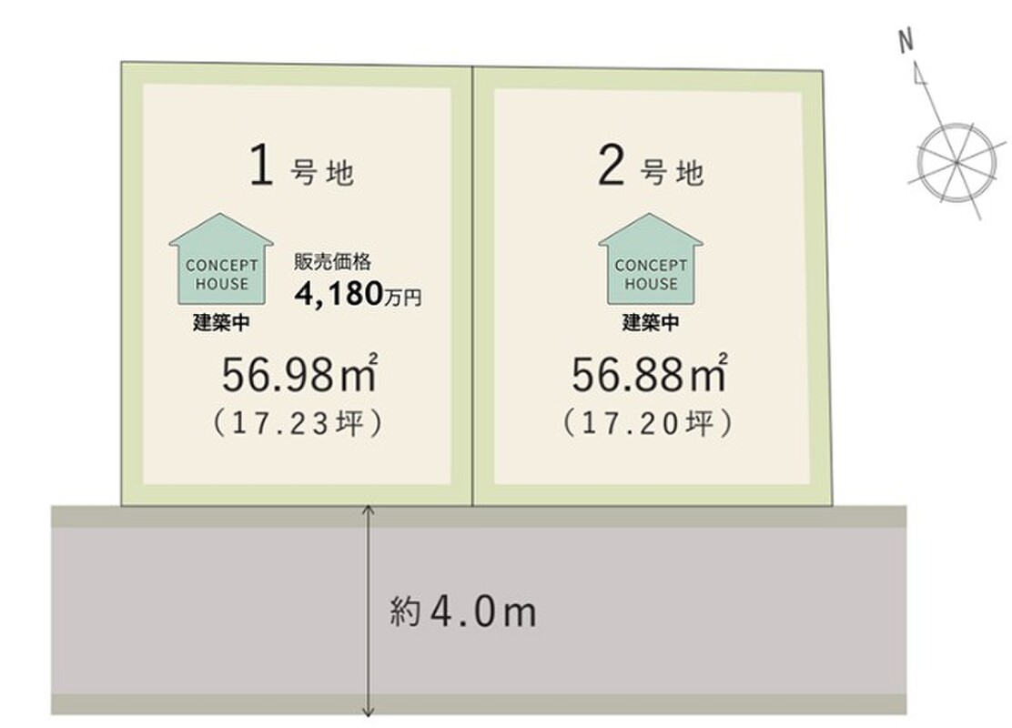 | 駐車場 | 1台(車種による) | 道路の幅員 | 約4m、アスファルト舗装、持出道路:13.50m2(1号地)(セットバック済) |