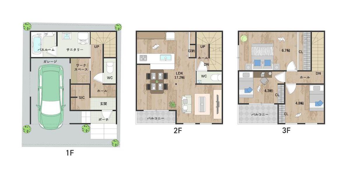 LDKは約17.2帖。2階リビングにつき、外からの視線が気になりにくく、ゆっくり寛げます。1階にワークスペースあり。2階と3階に南向きバルコニーを設けた明るい住まいです。