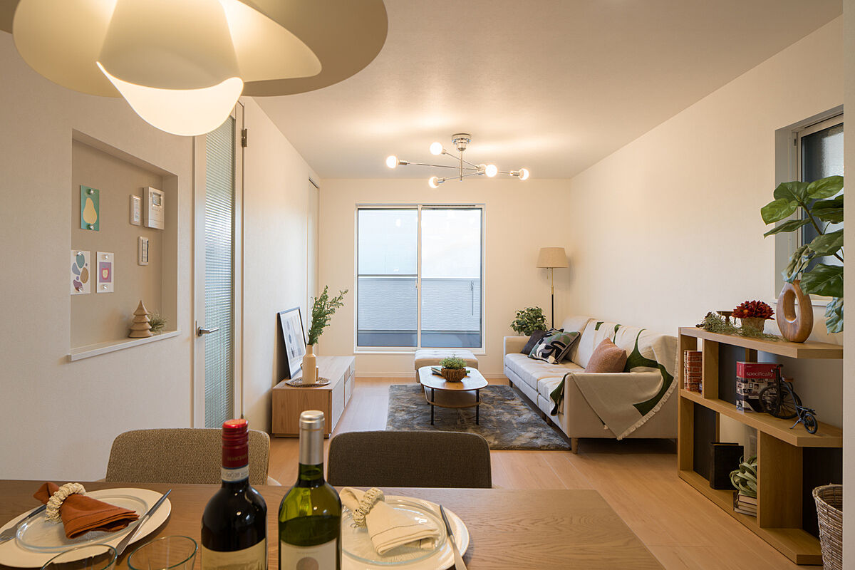 寛ぎスペースのリビングと、食事スペースのダイニングを区分けして家具を配置できる奥行きのあるレイアウトです。出入口横には、ディスプレイを楽しめる造作ニッチを施しました。