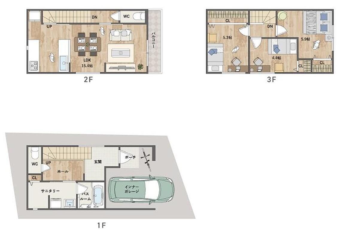 採光やプライバシーに配慮した2階リビング仕様。3階に配置した洋室3部屋は振り分けタイプで、プライバシーも確保。お車1台分のインナーガレージ付きです(車種による)。