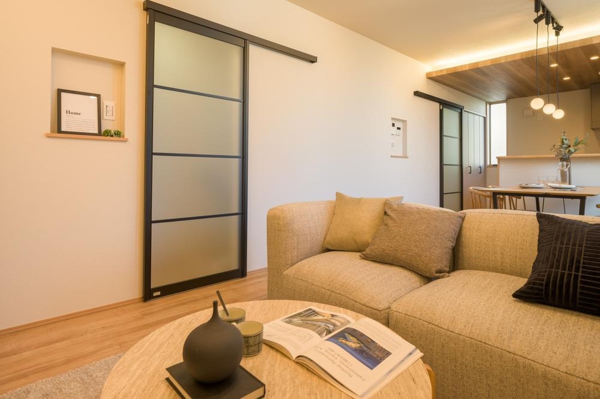 ご家族が集うLDKは約18.2帖の広さ。2ヶ所のドアは、開閉時にデッドスペースがうまれない引き戸を採用しました。家具配置がしやすく、スムーズな動線です。