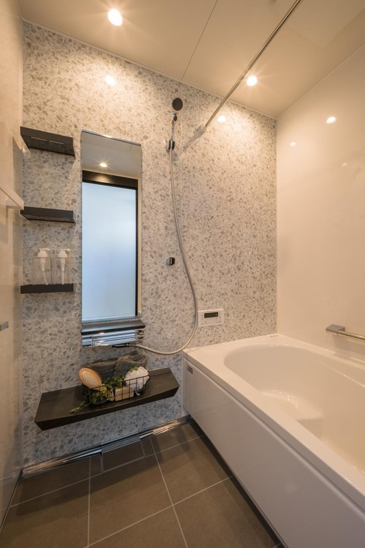モノトーンカラーでまとめた清潔感のある浴室。浴槽は、半身浴やお子様のステップに活用できるベンチタイプです。浴室乾燥機を標準搭載しており、雨の日でも洗濯物を乾かせます。