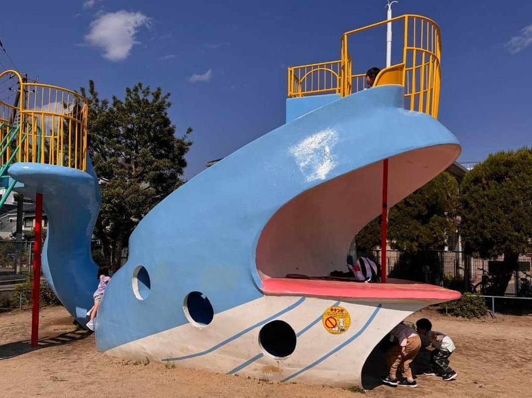大きなクジラの遊具が特徴の公園。滑り台・ブランコ・鉄棒が設置さ...