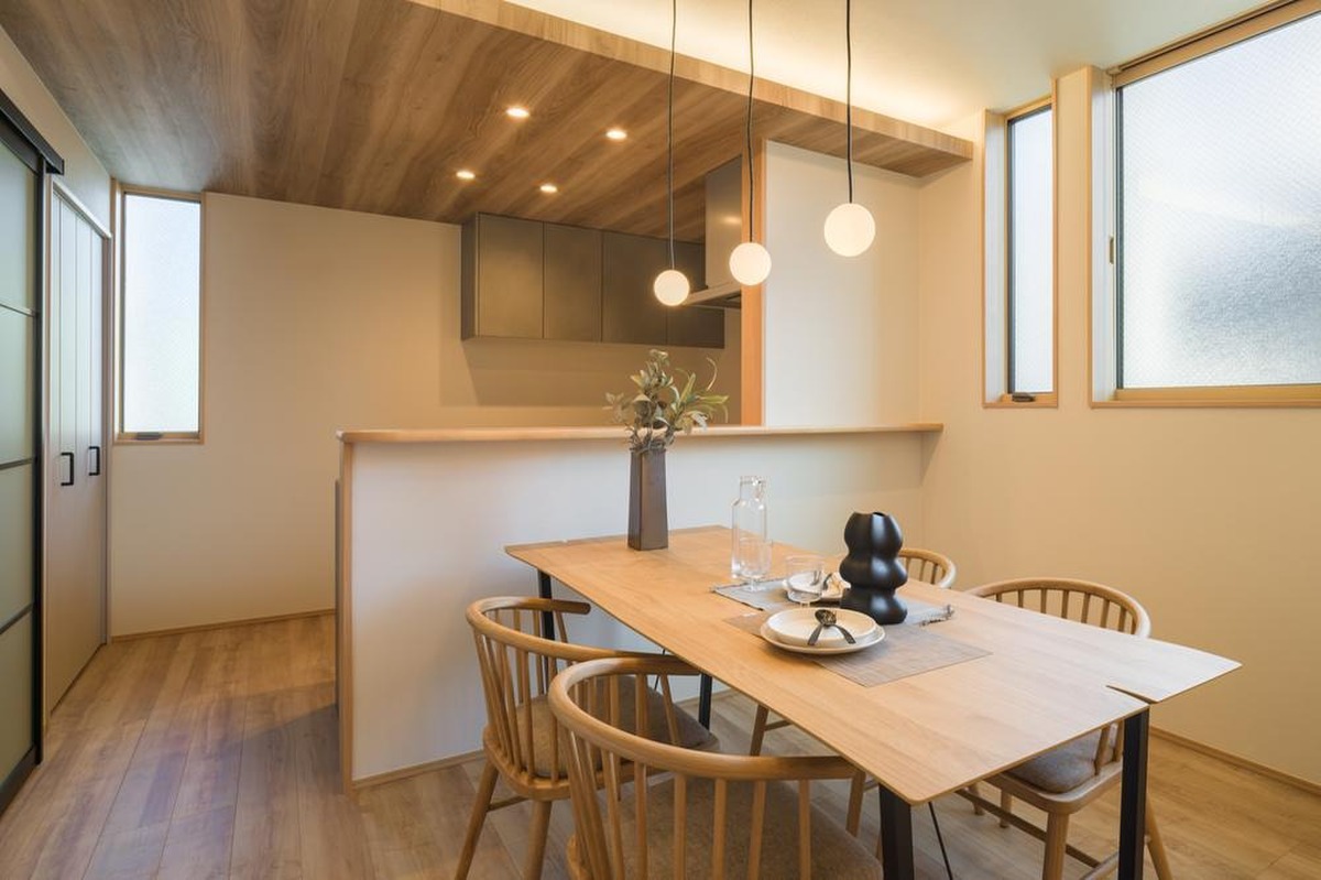 温かみのある木目と照明が温もりを添える、心地よい内装デザイン。窓から差し込む自然光と室内照明、異なる雰囲気の光をお楽しみいただけます。