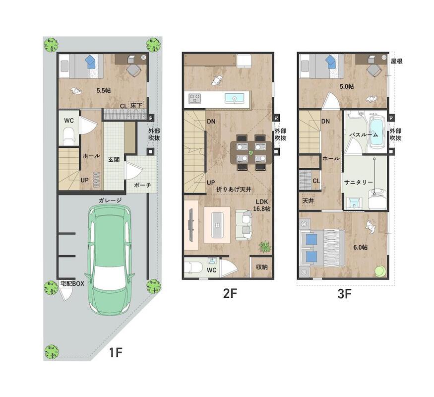 - ※完成予想図やCG合成画像は、門塀・植栽・庭・外観等、実際とは多少異なる場合があります。