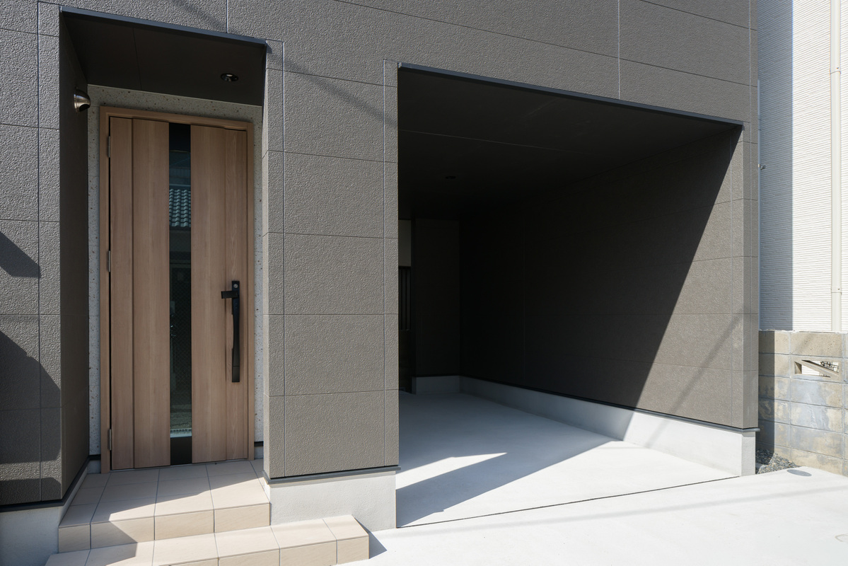 限定1棟のコンセプトハウスが完成しました。夜は玄関ポーチに施した照明が、住まいを温かく、上品にライトアップ。1台分のガレージを備えています(車種による)。
