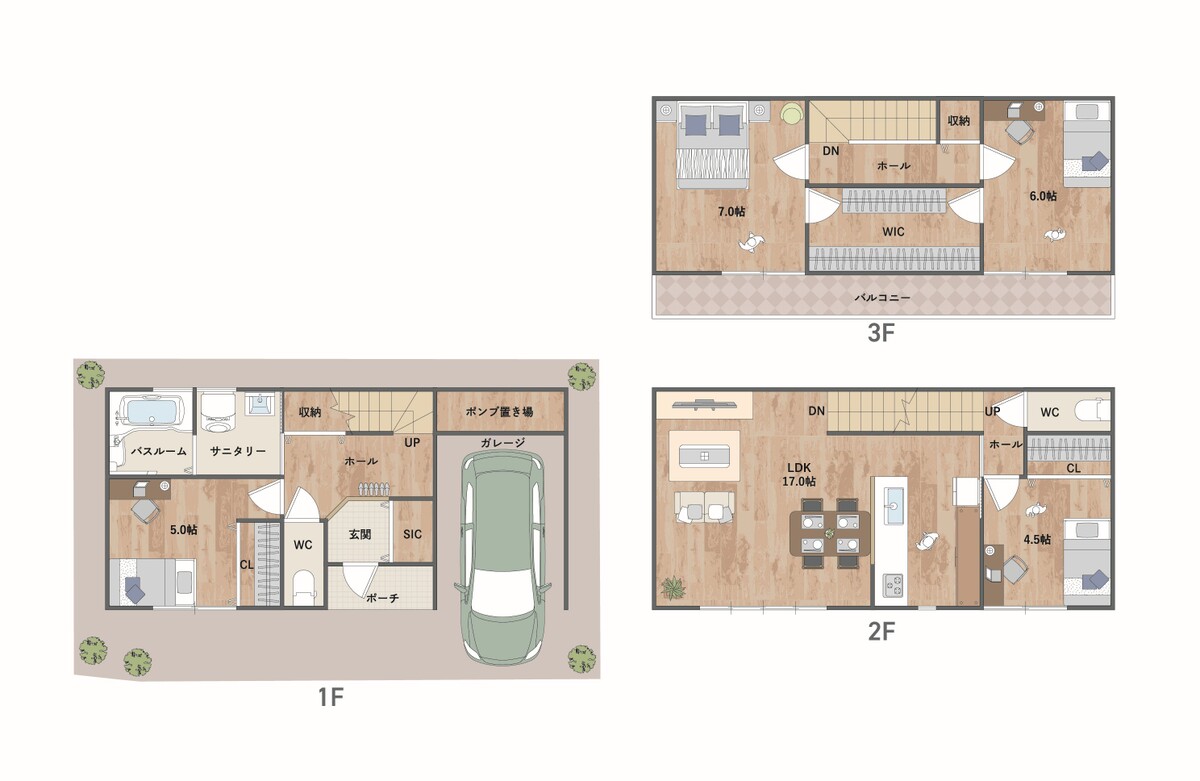 - ※完成予想図やCG合成画像は、門塀・植栽・庭・外観等、実際とは多少異なる場合があります。