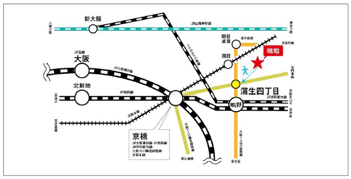 - Osaka Metro長堀鶴見緑地線「蒲生四丁目」駅 徒歩12分JR大阪環状線「京橋」駅 バス7分「今福西六丁目」バス停 徒歩3分京阪本線「京橋」駅 バス7分「今福西六丁目」バス停 徒歩3分