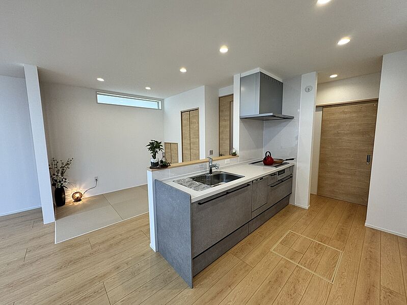 玄関⇔洗面室⇔キッチン⇔リビングが回遊動線で効率のよい移動が可能♪玄関ホールのオープンクロークに上着などを収納して室内へ。キッチンと洗面室の間には食品・日用品をパッと取り出せるウォークスルーの収納あり。天気や時間帯を気にせず洗濯機から出したらすぐ干せるホスクリーン付き。リビングにはお昼寝や来客時に便利な畳コーナーあり♪
