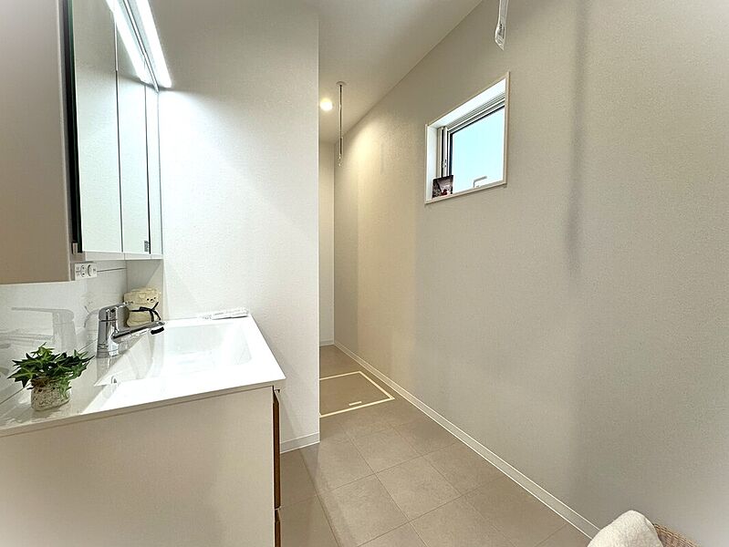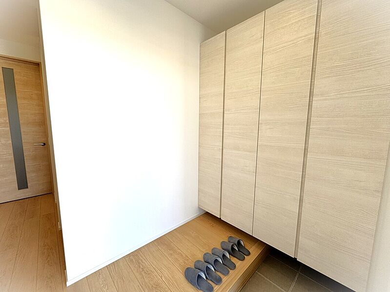 ~広々前面道路と快適回遊動線の家~1階ホールにウォークスルーのオープン収納を配置。サッと上着やバッグを収納。キッチン横にパントリー。洗う・干すが叶うランドリールーム。。簡単キレイに整う仕組みです。