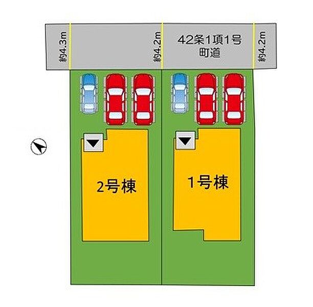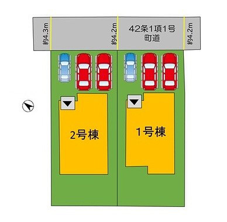 | 駐車場 | 3台 | 道路の幅員 | 2号棟:北東4.2m |