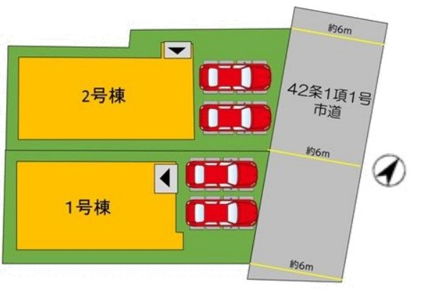 | 駐車場 | 2台 | 道路の幅員 | 2号棟:北東6m |