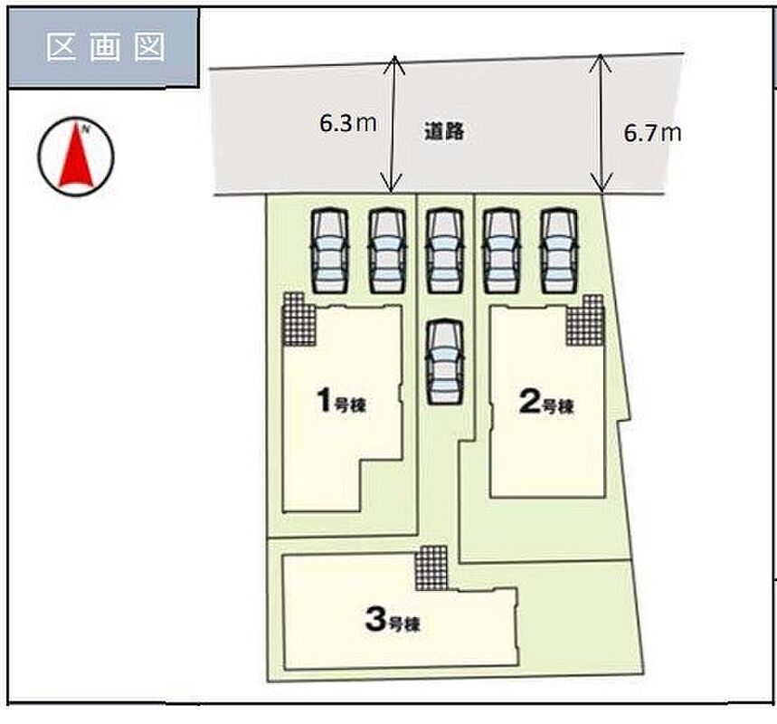 | 駐車場 | 2台 | 道路の幅員 | 1号棟:北6.3m |