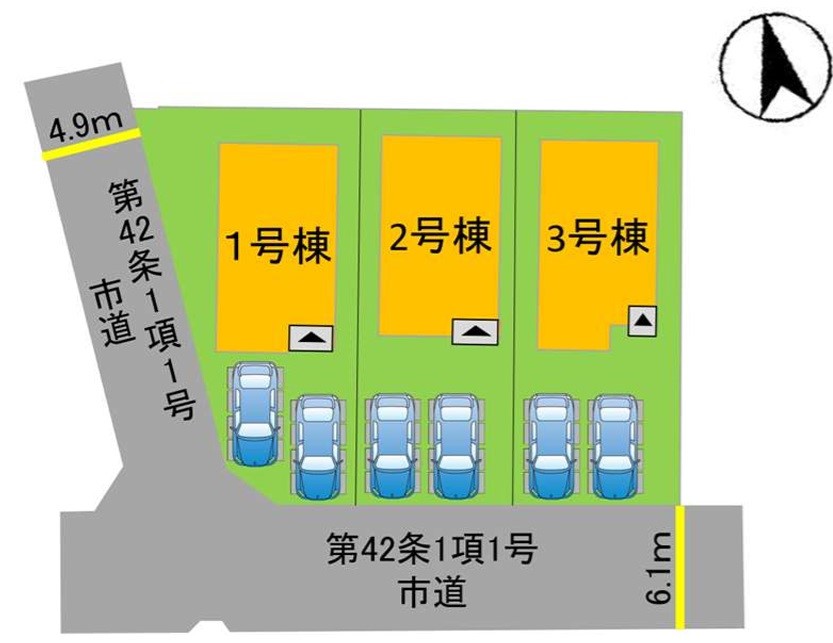 | 駐車場 | 2台 | 道路の幅員 | 1号棟:南西6.1m 西4.9m |