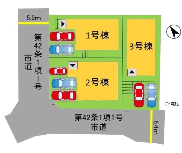 | 駐車場 | 3台 | 道路の幅員 | 2号棟:北西5.9m 南西6.4m /3号棟:南西6.4m |