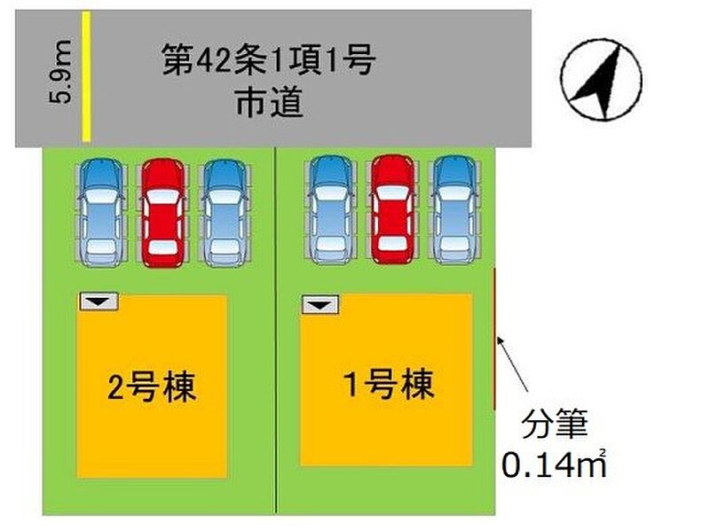 | 駐車場 | 3台 | 道路の幅員 | 2号棟:北5.9m /1号棟:北5.9m |