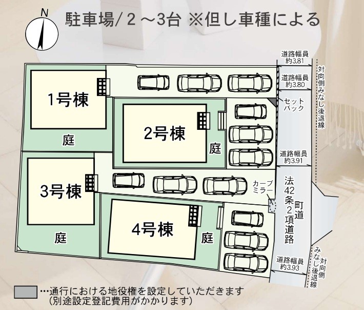 | 駐車場 | 3台 | 道路の幅員 | 2号棟:東4m |