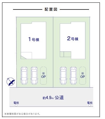 | 駐車場 | 3台 | 道路の幅員 | 1号棟:南西4.9m /2号棟:南西4.9m |