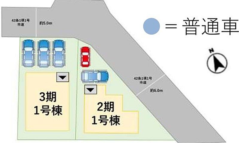 | 駐車場 | 3台 | 道路の幅員 | 1号棟:北5m |