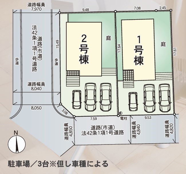 | 駐車場 | 3台 | 道路の幅員 | 2号棟:南4.8m 西8m /1号棟:南4.8m |