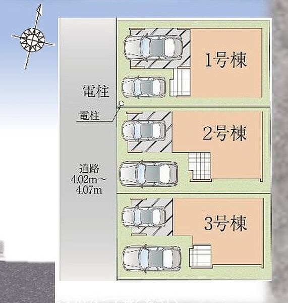 | 駐車場 | 1台 | 道路の幅員 | 1号棟:南西4m /2号棟:南西4m /3号棟:南西4m |
