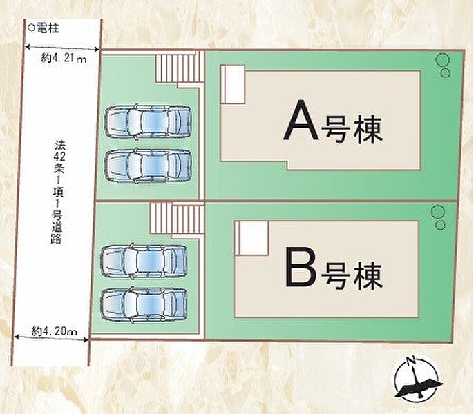 | 駐車場 | 2台 | 道路の幅員 | A号棟:西4.2m /B号棟:西4.2m |