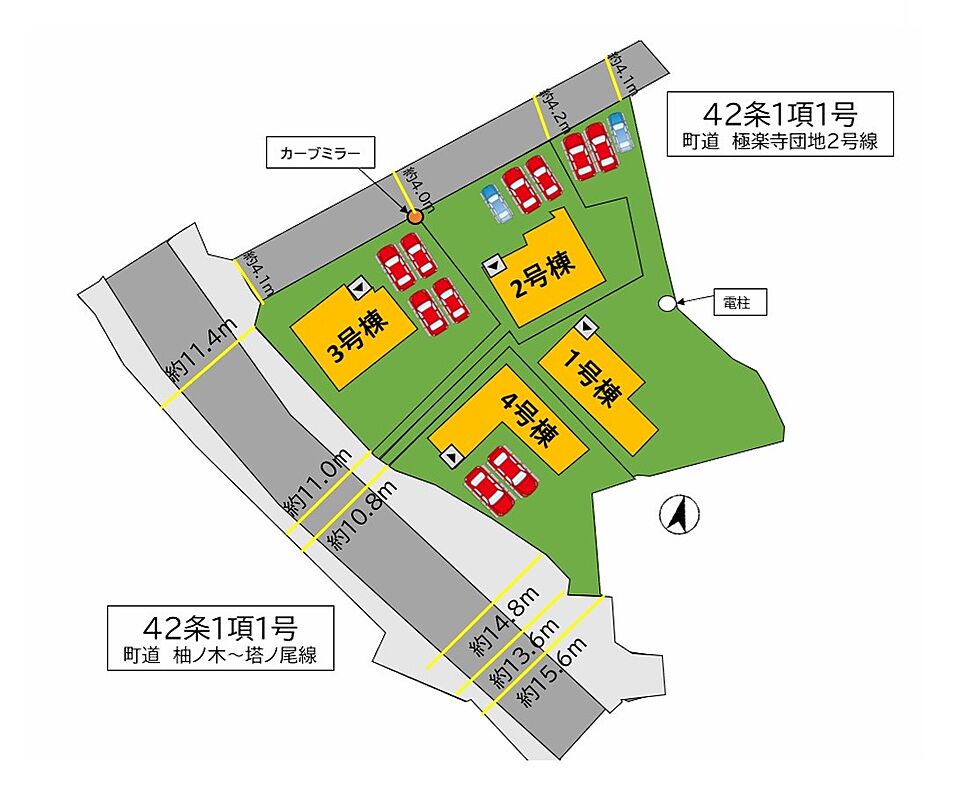 | 駐車場 | 2台 ~ 3台 | 道路の幅員 | 4号棟:南西10.8m /2号棟:北西4m 南10.8m |