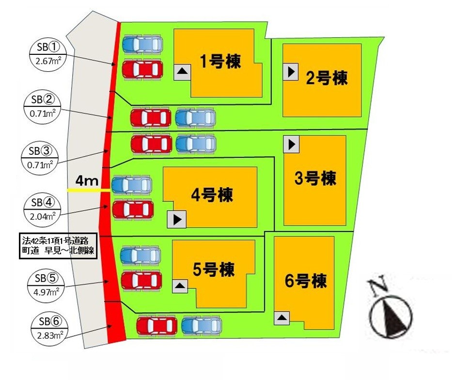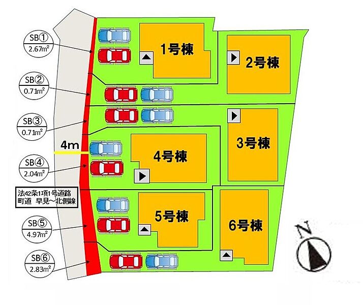 | 駐車場 | 2台 | 道路の幅員 | 6号棟:西4m /2号棟:西4m /4号棟:西4m /1号棟:西4m /3号棟:西4m /5号棟:西4m |