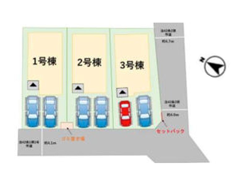 | 駐車場 | 2台 | 道路の幅員 | 2号棟:南西4.1m /1号棟:南西4.1m |