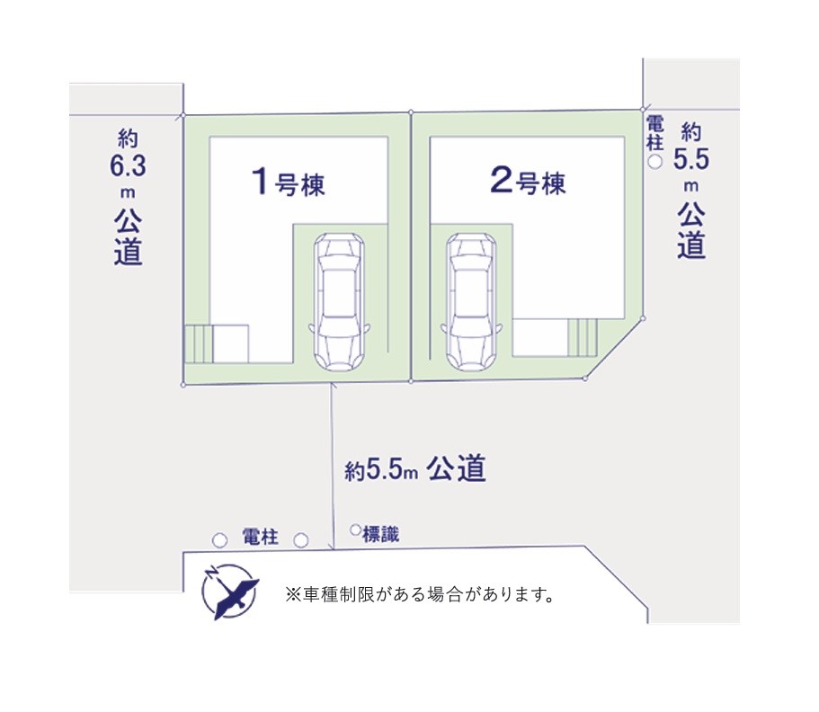 | 駐車場 | 1台 | 道路の幅員 | 2号棟:南西5.5m 南東5.5m |