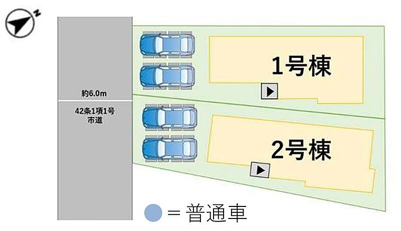 | 駐車場 | 2台 | 道路の幅員 | 1号棟:南6m |