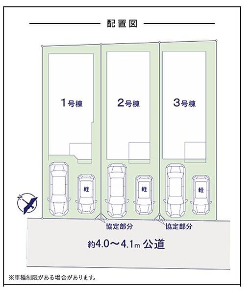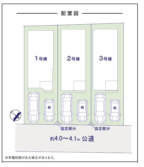 | 駐車場 | 2台 | 道路の幅員 | 3号棟:南西4m /2号棟:南西4m /1号棟:南西4m |